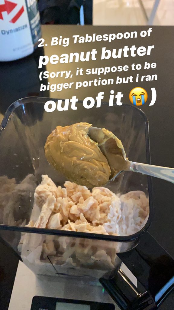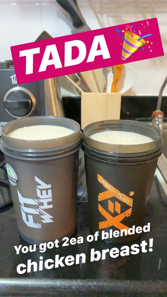 เรียกสูตรนี้ว่า อกไก่ปั่น สูตรคนขี้เกียจ เพราะว่า ไม่ต้องบีบน้ำออก ก็ยังได้รสชาติที่พอทานได้ (กลบด้วยเนยถั่ว และนมเปรี้ยว) ล้างน้ำ บีบน้ำ หลังต้มไก่ แค่ทีเดียว ไม่ต้องเค้นหนัก