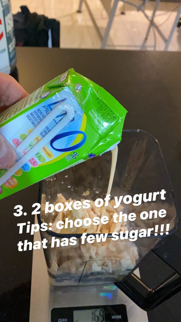 - ใส่นมเปรี้ยว 1 กล่อง (หรือ 2 กล่องได้ ถ้าต้องการรสชาติที่ดี แต่จะมีน้ำตาลเยอะ)