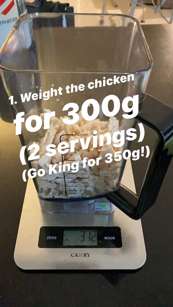 - อกไก่ชั่งสุก 300 กรัม (เพิ่มเป็น 350, 400 กรัม ได้)
